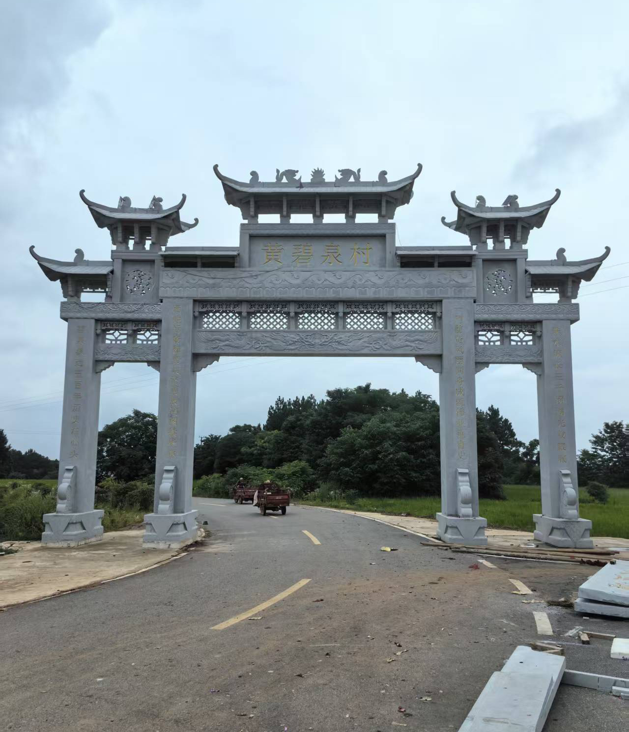 石雕牌坊是一种以天然石材为原料,经雕刻、打磨、拼接等工艺制成的传统建筑装饰构件,常见于园林、景区、村落入口、宗祠、陵园等场所。其主体结构通常由立柱、横梁、额枋等部分组成,顶部可设计为单檐、重檐或歇山式等传统建筑样式,表面雕刻有龙凤、花鸟、瑞兽、神话故事、吉祥文字等图案,兼具艺术性与文化内涵。产品材质涵盖青石、花岗岩、大理石等,可根据需求定制不同尺寸、造型及雕刻主题,满足多样化场景需求。